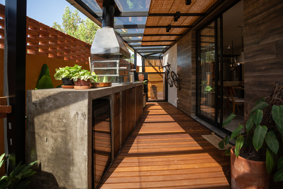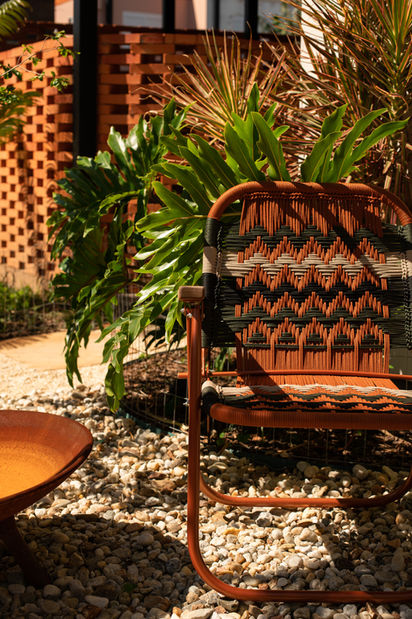 A área externa oferece ambientes de descanso e lazer integrados ao interior da casa. Na área gourmet, o pergolado metálico reúne diversas funcionalidades — churrasqueira, suporte para pranchas, pia, ducha e armazenamento — garantindo integração e praticidade de usos. A escolha pela estrutura metálica do pergolado foi feita considerando as esquadrias já existentes na casa, também pretas. Para trazer mais rusticidade e aconchego ao espaço, trabalhou-se com materiais naturais, tons terrosos, vegetação tropical e um incrível jogo de luz e sombras.